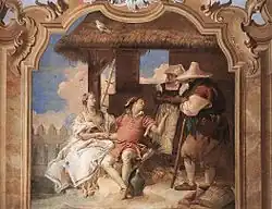 Angelica takes Medoro off to a shepherd's hut, and nurses him there, falling in love with him in the process. When he is fully recovered they depart. The Villa Valmarana Tiepolo cycle (1757) shows both scenes. The most popular scene in art is of the lovers carving their names into a tree in a sylvan setting; most often Angelica is shown doing the carving. It is when the hero Orlando, who is in love with Angelica, finds the names that he becomes furioso or mad.[4]