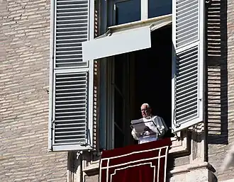 Pope Benedict XIII on 14 September 1724 added to the recitation of the Angelus the 100-day indulgence for the faithful who recited it on their knees (standing on Saturday evenings and Sundays) at dawn, at midday and at sunset, at the ringing of the bell.[24] Leo XIII (1878-1903) modified, making them easier, the conditions for obtaining the gift of indulgence. Until the reform of indulgences implemented by Pope Paul VI in 1967[25] was still granted the indulgence of 100 and plenary once a month, provided that he had recited it every day at the three prescribed times of the day (dawn, midday, sunset), and had confessed and communicated.[26]