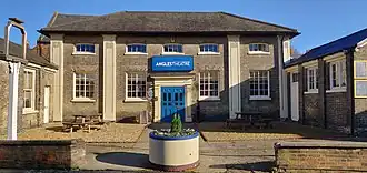 In 1978, the theatre building was "rediscovered" by drama enthusiasts looking for a space to rehearse their productions, and they renovated it, together with the former school, under its old name, Angles Theatre.[1] On 25 November 1978 a civic opening of the building was attended by the Mayor of Wisbech and chairman of Fenland District Council and presided over by Anton Rogers. Richard Leacroft, architect and theatre historian, gave a lecture on the development of regional theatre. Another speaker was Gregor MacGregor of the Georgian Theatre Royal in Richmond, North Yorkshire. Four days later the Angles Theatre Company staged She Stoops to Conquer.[86] This was one of the most regularly staged plays in the theatre's heyday. This may be in part because its author, Oliver Goldsmith, stayed with the Lumpkin family at Park House, Leverington, and lampooned his friend Nicholas Lumpkin (1748–1825); Goldsmith may even have written part of the play while at Park House. After spending much of his wealth Lumpkin moved to Wisbech where he died in 1825.[87][88]