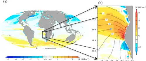 The physical properties of the ABF have been studied by historic hydrographic data, satellite-derived sea surface temperature observations,[1][8] in situ measurements[9] and by model-based studies.[10] All of the findings are in general agreement that the front is oriented normal to the coast and stretches offshore in a west to north-westerly direction between 15 and 17°S.[9] The front has an average width of about 200 km, but it can be much narrower at certain times, with steeper temperature gradients. The average distance the front penetrates seawards from the coast is 250 km, but traces can be found up to 1000 km offshore. The region of the frontal zone was previously defined by a characteristic temperature gradient of between 1 °C per 28 km and 1 °C per 90 km.[9] A more recent study[1] calculated a meridional sea surface temperature gradient of 1 °C per 34 km (or 3 °C per 100 km) across the ABF in austral summer, whereas Colberg and Reason (2006) estimated ~4 °C per 100 km in the middle of the ABF.[10] The sharpest temperature gradients are found within 250 km of the coast. Multiple sharp fronts can also occur, especially when the Angola Current is strongest in austral summer.[9]