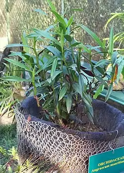 Angraecum mauritianum is a small, epiphytic species of orchid. It is native to Mauritius where it can still be found along roadsides. It favours low tree trunks or logs, and does not grow higher up in trees.[1]