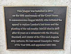 The 30th anniversary of the Great Storm of 1987 was marked with the installation of a memorial plaque[17] for McGill who led a Standard campaign to help replant the capital's 250,000 trees destroyed by the hurricane-force winds.[18] The tree appeal raised more than £60,000 from readers and this went towards planting trees in every London borough.[19] On 13 October 2017 his colleagues and family gathered beneath an oak tree outside London's Charing Cross station where the Lord Mayor of Westminster, Cllr Ian Adams, unveiled a bronze plaque in his honour, saying that he was "an integral part of the fabric of London life". The new plaque complemented an earlier one above it, which was unveiled by Westminster City Council in 1988,[20] when it also planted the oak as a sapling.[21] Cllr Robert Davis, Deputy Leader at the council added: “Westminster City Council will be for ever grateful for the efforts of the Evening Standard and its readers for raising money through a tree appeal, led by Angus McGill.”