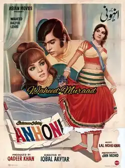 Anhoni is a 1973 Pakistani film directed by Iqbal Akhtar, starring Waheed Murad, Aliya Begum and Lehri. It was premiered on 21 December 1973.[1] Lal Mohammad Iqbal composed the music in the voices of Ahmed Rushdi and Runa Laila.[1]