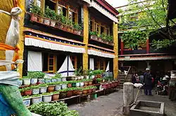 The word ani (Tibetan: ཨ་ནི, Wylie: a ni) means 'nun', and tshamkhung (Tibetan: མཚམས་ཁུང, Wylie: mtshams khung) means 'a place for spiritual retreat', or 'hermitage'.[1] Ani Tsankhung occupies a yellow building in the Barkhor area of downtown Lhasa.[2] It is southeast of the Jokhang temple, and is the only nunnery in the old city of Lhasa.[3] The building is three stories high.[4] In the main hall there is an image of Chenresig, the multi-armed Bodhisattva of Compassion. Behind this there is a 7th-century meditation chamber that was used by Songtsen Gampo.[2] The nunnery has a collection of thirteen Thangkas from Ming and Qing dynasties depicting Buddhas and Bodhisattvas.[5]