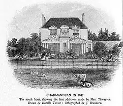 In 1841 she acquired her country house and estate, Charmandean at Broadwater, West Sussex.[11][2][14] She maintained Samuel Smith and his family at Charmandean, funding his daughters' education until they left to marry. Meanwhile, Samuel managed her accounts.[2] Ann made many additions and improvements to Charmandean. In one room she installed panelling which had been removed from St. Mary's Church, Broadwater during repairs, and in her chapel-room she fitted a stained-glass window from the same church.[15] She added an iron-framed conservatory, and two pairs of wrought iron entrance-gates made as replicas of the former Buckingham Palace gates. The western gates were requisitioned in World War II. The eastern iron gates remained in Charmandean Lane for some years but are now gone, leaving only the carved gateposts.[16] The house was demolished in 1963.[2][17]