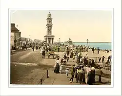 Besides straightforward compassion for the poor, there are two other possible motivations for Mrs Thwaytes's philanthropy. Firstly there was the 19th-century progress of Evangelicalism, which encouraged good works from those with religious sensibility and social pity. Secondly, following the expansion of the middle classes in the 18th and 19th centuries, beneficence was "an avenue for entry into elite society for women and gave them a sense of place and direction outside the home."[21] In other words, for a woman of known humble origins and at the same time a wealthy widow looking for a place in society, philanthropy would be in her best interests. However 19th-century British elite society was based in the popular imagination upon elegant culture, not money or good deeds, and Herne Bay Clock Tower's opening ceremony drew mockery from the Figaro in London of 6 October 1836, in which she was called a Cockney and her clock, celebration and philanthropy laughed at.[22]