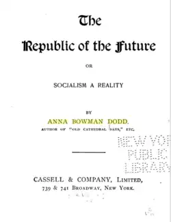 Cathedral Days, a story of a season spent in the English cathedral towns, enjoyed success, as did the second book, The Republic of the Future (New York : Cassell & Co.). It was apparent that Edward Bellamy drew much of the inspiration for his utopian prophecy from The Republic.[2][1] In The Republic, Dodd attempted the prophetic role, and presented a view of life at the middle of the 21st century, when the theories of Henry George would become completely realized. She wrote that death would save us from the problem of justice, liberty, equality, and fraternity. She described a nation of intellectual mediocrity where it was a crime to excel in anything, and where aristocracy and learning are detested and feared. The book's universe was based on a rigid equality, one house being precisely like every other house; where everyone's clothes were the same; where women were on the same footing as men; where there was no home life; where the children were reared in a government "kindergarten" without a parental love or care; where even food was prescribed by a state official, and in the shape of pellets sent whirling into the socialist's alimentary canal through a government "culinary duct"; where the people were pining away from mental and physical inactivity; where there was no God, no religion, no object in life worth living for, but there was a centralized government.[5]