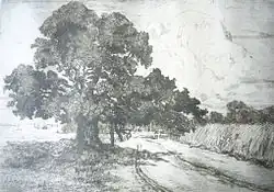 The many landscapes she produced of the countryside in and around Worpswede apply very different techniques. Some, notably from her particularly productive period around 1903/04, apply a much more generous technique with less concern for perspective and little sign of the meticulous detail of the cityscapes. The landscapes tend to use aquatint. Their expressive quality is achieved not so much by invoking a wide range of different colours as through a velvety variability of the shading, achieved through the alternative technology selected.[1]