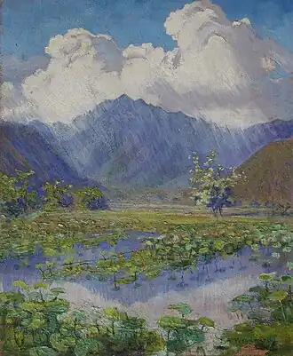 Her works have been exhibited in many galleries throughout the United States and France, including the Carnegie Institute in Pittsburgh, Pennsylvania. She exhibited for two exhibition seasons at the Institute in 1909, in between her back-and-forth travels to Paris.[13] She was also exhibited throughout local galleries in Hawaii and the Honolulu Academy of Arts for her depictions of the Hawaiian Islands.[14] Her works, A Honolulu Garden, Manoa Valley, and The Dunes are among her more well-known pieces that are representative of the Hawaiian landscape.