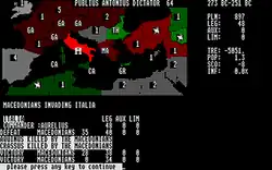 The game is played in two windows. The first is the troops movement window, which allows the player to control the placement of troops in the Roman state or to attack computer players. This window shows the number of forces for all players, inflation, popularity and national score of the Roman state, and human player score. The last step for the player in this window is to set the tax rate, between 1.0 and 2.0% (higher taxes cause higher inflation). In the next window, the player decides which of the 21 Senate members will receive command of the various Roman armies. To help the player in making this decision, all Senate members are listed with numbers, the first two indicating their military ability and loyalty, respectively. The last number indicates their age. If the government's popularity falls below 2 (popularity is measured within a range between -5 and +5), armies with disloyal commanders can revolt and try to take Rome. If this happens before 50 BC, the successful rebel will be declared dictator, and if this happens after, he will become emperor, which will lead to a dynasty.