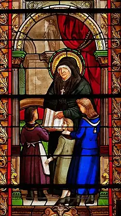 In 1794 the authorities confiscated the building in which the school was run and Rivier and her companions moved to the town of Thueyts where Father Luigi Pontanier provided them support (he was a member of the Society of Saint-Sulpice). It was in the attic of the new school that - on 21 November 1796 - the five women dedicated themselves to God which was the formal foundation of her new religious order.[1] The group pledged themselves to teaching and began working with orphans and visiting people in their homes. In 1797 the group had increased to twelve and the women made their religious professions on 21 November 1797. The Concordat of 1801 allowed for religion to be practiced once more in France and the fledgling congregation grew as a result of this. Due to the rapid increase in membership the motherhouse was moved to larger premises in Bourg-Saint-Andéol in 1815.[3][2] In 1805 the order received a blessing and encouragement from Pope Pius VII who was crossing France to go back to Rome. She and several others were vested in the habit for the first time on 21 November 1807.