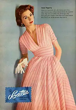 While at Youth Guild, Fogarty developed one of her signature looks, the tight-bodied dress with a very full skirt worn over a stiffened nylon petticoat, influenced by Dior's New Look.[9] As Fogarty was a junior size 7, with her small 22-inch waist and modeling experience, she was able to wear and show her own designs to advantage.[10][11] Some of her dresses were featured in a double-page spread in Harper's Bazaar.[6] In 1950, Fogarty was offered a design job at Margot Dresses, a company specializing in junior fashion.[6] She worked there for seven years, designing not just dresses, but accessories, lingerie and outerwear.[6] In 1957, Fogarty moved to Saks Fifth Avenue, where she was one of the main designers.[12] She launched her own firm, Anne Fogarty Inc., in 1962, and in the mid-1960s, launched several spin-off labels including A.F. Boutique, Collector's Items by Anne Fogarty, and Clothes Circuit.[12][13] She retired in 1974 and closed her business. Despite this, she worked up until her death as a free-lance designer, with her last collection created for Shariella Fashions in 1980.[12]