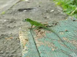 Anolis evermanni, also known commonly as the emerald anole, Evermann's anole, and the small green anole, is a species of lizard included within the family Dactyloidae.[2][3] A. evermanni is native to Puerto Rico, where it is mainly found in wet forests. A. evermanni is a medium-sized lizard and bright emerald-green in color.[2][3] A. evermanni is studied for its behavior as well as the evolution of the family Dactyloidae. The group of lizards which are member species of the family Dactyloidae are known as anoles.[4][5] Anoles are found throughout the Americas and are related to iguanas.[6]