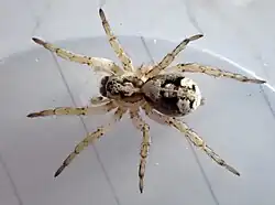 The male is recorded at 6.4-8.5mm in length whereas the female is 8.2-9.1mm. The colouration of the body camouflages it in sandy habitats. The carapace is coloured yellow with dark markings dorsally. The legs are pale yellow with black patches. The abdomen is yellow with a variety of dark and pale markings.[1]