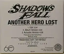 "Another Hero Lost" is the second single from the album Threads of Life by the thrash metal band Shadows Fall. Unlike most other Shadows Fall songs, it is a soft ballad. It was written about singer Brian Fair's cousin, who died in the U.S. war in Iraq.[1] During concerts the band dedicates the song to soldiers fighting, and ones who have died in Iraq. The song reached #40 on the Mainstream Rock Chart. On November 17, the video debuted on MTV's Headbangers Ball and MTV2.
