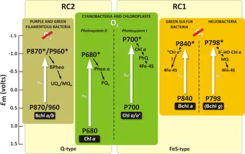 There are two main types of anaerobic photosynthetic electron transport chains in bacteria.[14] The type I reaction centers are found in GSB, Chloracidobacterium, and Heliobacteria, while the RC2 are found in FAPs and purple bacteria.[10][14][15]