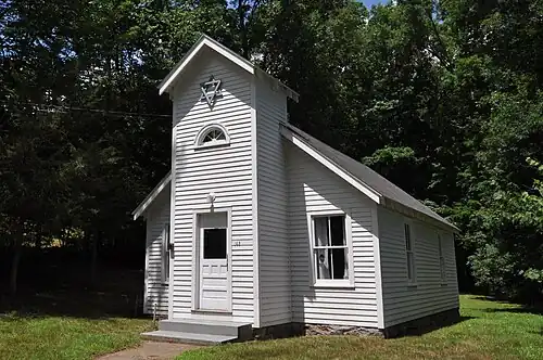 Harry Rothenberg donated the land for the synagogue around 1936. The congregation pooled their money,[2] and George Allen & Sons built the structure in 1836. The Anshei Israel Synagogue is a 20 by 30 feet (6.1 by 9.1 m) gable-roofed clapboarded building with a 5 feet (1.5 m) by 9 feet (2.7 m) central projecting tower which features a Magen David at its top. Flanking the tower on each side is a pair of two-over-two windows. Paint remnants show that the sash was previously painted a bright blue.[3]