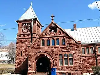 The Ansonia Library stands in a mainly residential area a short way east of downtown Ansonia, on a triangular parcel at the junction of South Cliff Street and Cottage Avenue. It is a two-and-a-half-story building with load-bearing brownstone walls, 82 by 70 feet (25 m × 21 m) in plan. Its walls are 2 feet (0.61 m) and thicker. Its asymmetrical plan is visually dominated by a square tower on the left side, with a clock in its upper stage and a pyramidal copper roof. The main entrance is set near the center of the South Cliff facade, recessed under a large round arch. The gable above the entrance has a rose window near its peak.[2]