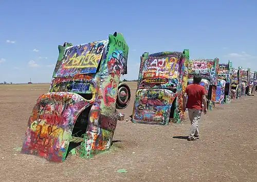 In Amarillo, Texas, Ant Farm half-buried a row of 10 used and junk Cadillac automobiles dating from 1949 to 1963, nose-first in the ground, at an angle corresponding to that of the Great Pyramid of Giza. The installation is set up to the west of Amarillo near Interstate I-40 on the famous former Route 66.