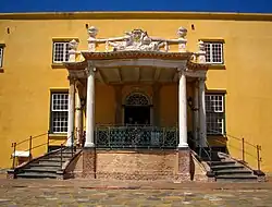 During the years 1785 to 1791, Governor of the Dutch East India Company Colony Cornelis Jacob van de Graaff made a number of improvements to the Castle of Good Hope.[2] These included a portal to the Governor's residence, called the Kat Balcony.[Note 1] Anreith produced a painted teak portico and entrance portal. The stucco parapet, Ionic columns, folding door and fanlight, along with teak lion doorknockers, are signature Anreith.[10]