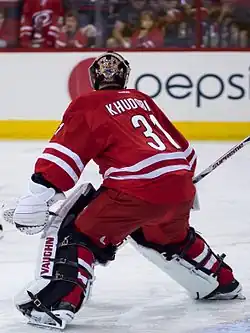 On 5 July 2013, the Carolina Hurricanes signed Khudobin as a free agent to one-year, one-way contract paying $800,000.[18] His early start with the team began slowly after suffering an ankle injury on 13 October against the Phoenix Coyotes, resulting in a temporary conditioning stint in the AHL.[19] Despite this, in his first year with the team he posted a 13–8–0 record with 2.17 goals-against average and .927 save percentage over 22 games.[20] By January, he was named the NHL's First Star for the month after tying a franchise record for wins in a month with 10 and registering a goals-against average of 2.19 in 14 games.[21] At the conclusion of the season, the Hurricanes President and General Manager Jim Rutherford re-signed him to a new two-year, $4.5 million contract, saying "he has played well this season and signing him helps solidify our team’s goaltending situation."[20] Following a successful season which saw him posting team-highs in save percentage and wins, Khudobin suggested that he felt he would supersede his fellow goaltender Cam Ward as starting goaltender for the team the following year.[22]
