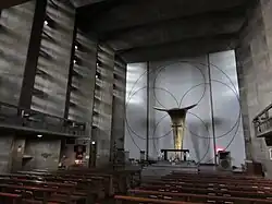 Located to the east of the Nanzan Campus is the Divine Word Seminary Chapel (1962). This is a building that exploits the plastic capacity of concrete, with two intersecting shells forming a bell tower. These are punctured with vertical slots which allow light to radiate along the curved interior walls.[43]