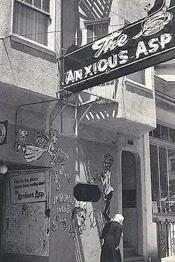 It began in 1955 as a cabaret with the same name, and was purchased in 1958 by Arlene Arbuckle.[2] Arbuckle also owned the Paper Doll Club, and The Capri.[3] Arbuckle had pivoted The Anxious Asp to a more mixed queer and bohemian crowd (many of which were related to the Beat movement), and they shared staff and clientele with "The Place" and Vesuvio Cafe.[2][4] The restrooms were wallpapered with pages from the Kinsey Reports, two controversial human sexual behavior books.[2][4] Notable clients to the former bar included Janis Joplin,[5] and Lew Ellingham.[4]