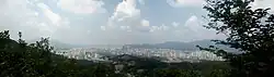 Anyang spans 58.46 square kilometres (22.57 sq mi). Forest and fields constitute 30.15 km2 (11.64 sq mi), urban development constitutes 11.51 km2 (4.44 sq mi), dry fields constitute 1.8 km2 (0.69 sq mi), rice paddies constitutes 1.25 km2 (0.48 sq mi), and other land use constitutes 13.76 km2 (5.31 sq mi).[3] Anyang is surrounded by mountains on all four sides. These mountains are Gwanak Mountain and Samsung Mountain to the north, Suri Mountain to the southwest, and Cheongye Mountain and Morak Mountain to the other sides. There are eight streams and rivers in Anyang, with a length of 34 kilometres (21 mi).