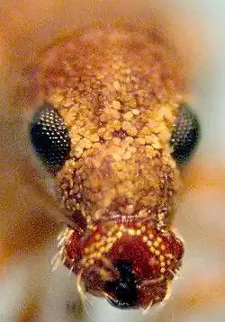 Most anypotactines are small (approx. 4–11 mm), covered by brown scales, with some members of the genus Prepodellus covered by metallic green or blue scales.[6] The dorsal surface of the body usually bears thick and erect scale-like setae, rather uniformly distributed. Members of the genus Hyphantus tend to be larger and dark in coloration.[4]