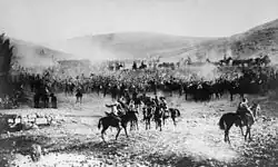 On 24 October, the 2nd Light Horse Brigade moved forward to Asluj to screen the advance of the ANZAC and the Australian Mounted Divisions.[65] On 31 October, Beersheba was captured after the town was attacked by two infantry and two mounted divisions. The 1st Light Horse and the New Zealand Brigades made a combined attack on Tel el Saba, after the 2nd Light Horse Brigade had cut the road north from Beersheba to Hebron. At 15:00 the same day, the New Zealanders attacked and captured with 132 prisoners and four machine-guns with a bayonet charge, while the retreating Turkish soldiers were pursued by the 1st Light Horse Brigade. Chaytor's troops were now in possession of Tel el Saba.[66][67] At 15:30, orders were issued for the final assault on Beersheba; the 1st Light Horse Brigade was tasked with capturing a line from a prominent mound outside to the Beersheba mosque.[68] Beersheba was finally taken following a mounted infantry charge by the 4th Light Horse Brigade.[69]