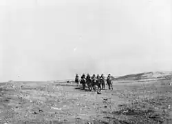 The British advance started on 14 February; five days later the division was established at El Muntar, six miles (9.7 km) west of the Dead Sea. Early on 20 February, the New Zealand Brigade conducted dismounted assaults on the hills Jebel el Kahmum and Tubk el Kaneiterah east of Bethlehem. Both hills were heavily defended and covered by artillery and machine-guns.[91] They found the going heavy and the Turkish defenders did not pull back until the hills were outflanked by the 60th (London) Division advancing to the north. Just after 14:00, the two divisions were closing in on the Jordan Valley when a troop from the 1st Light Horse Regiment reached the valley floor. They were soon followed by the remainder of the 1st Light Horse Brigade, with orders to advance north to the Wadi Jofet Zeben. Plans were formed for a joint attack on Nebi Musa, but the Turkish defenders withdrew that night. Instead the 1st Light Horse Brigade headed for Jericho, and at 08:00 the 3rd Light Horse Regiments entered the town virtually unopposed. The brigade pushed on towards the River Jordan and the bridge at Ghoraniye, and by nightfall the two brigades' and the division's artillery were positioned around the bridge. They were relieved the next day by the infantry and arrived back at Bethlehem in the early hours of 23 February.[92][93] The division left the Auckland Mounted Rifles, with a subsection of machine guns and an artillery battery – under command of the 60th Division – in the Jordan Valley holding a strong position where the road from Jerusalem falls into the valley.[94][95][96]