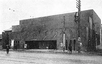 After the 1923 earthquake, it re-opened in October 1924 with a new, modern design created by prominent avant-garde artists. Seisaku Yoshikawa was in charge of architectural design, Yasuji Ogishima did the sculptural reliefs on the front of the building, and Tomoyoshi Murayama designed the interior.[1][2] Murayama also did the cover illustrations for the theater's pamphlets in the first few years.[3]