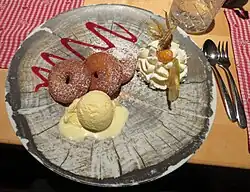 Since the end of the 18th century, it has become common to use a variety of sauces to refine dishes in Baden-Württemberg. As a popular dish in that area, Apfelküchle is often served with its own variety of sauces and sides.[1] The most common way to eat Apfelküchle is warm with cinnamon and sugar, or dusted with powdered sugar. One of the most popular refinements is to serve it cold with a vanilla sauce. It is also popular, especially among children, to serve Apfelküchle with vanilla ice cream.[3] Cooks in Baden-Württemberg also like to flambé it with Grand Marnier or rum and serve it with a little scoop of vanilla ice cream. Another sauce used to dress Apfelküchle is Chaudeausauce, a French term for hot water, which is composed mainly of wine, vinegar, lemon juice, egg yolks and sugar. It is traditionally made with white wine; usually champagne, and occasionally with a shot of cognac or sherry. It can be enjoyed both hot and cold.[1]