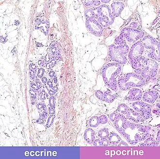 The apocrine gland is made up of a glomerulus of secretory tubules and an excretory duct that opens into a hair follicle;[13] on occasion, an excretory duct opens to the skin surface next to the hair.[14] The gland is large and spongy, located in the subcutaneous fat deep in the dermis,[9][15] and has a larger overall structure and lumen diameter than the eccrine sweat gland.[16][8] The secretory tubules of apocrine glands are single layered, but unlike the eccrine secretory tubules, contain only a single type of ductal epithelial cell,[17] varying in diameter according to their location, and sometimes branching off into multiple ducts. The tubules are wrapped in myoepithelial cells, which are more developed than in their eccrine gland counterparts.[18][19]