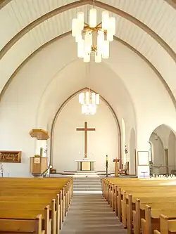 The foundation stone for today's building was laid in 1951 according to plans by Werner March, who had also designed the Olympiastadion Berlin. A pointed arched, barrel vaulted hall church with approx. 400 seats was built. Four corner columns with late Romanesque leaf capitals from the destroyed choir were reused. In the tower hall there is a chandelier from 1743. At the back of the church a sculpture by the sculptor Willy Meller, created in 1955 and known for numerous works in the service of National Socialism, commemorates the victims of the Second World War.[2]