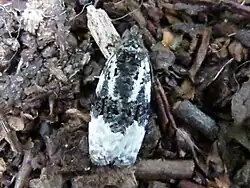 The wingspan is 19–23 mm. The ground colour of the forewings is grey and black in the basal part, with irregular white spots. Near the apex there is a wide white cross-band so that the wing tip seems almost pure white. The hindwings are grey-brown.