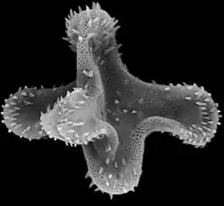 Aquillapollenites is an extinct morphogenus of Late Cretaceous angiosperm pollen grain. Aquillapollenites was a very large group containing something like 80 total species, but all of them were typified by their triprojectate structure: three processes extend from the equator of the pollen grain and one process extends upwards to each pole, giving Aquillapollenites the shape of a child's jack. This strange shape may improve the buoyancy of the pollen grain. Colpi occupy each terminus of the equatorial projectates, making Aquillapollenites tricolporate.[1]