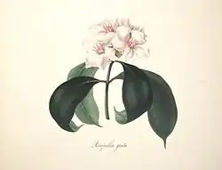 The Roupells returned to Madras in 1845 where Arabella Roupell continued her botanical painting. When Wallich retired to London from Calcutta in 1846, he persuaded her to allow him to take along some of her paintings to show to Sir William Jackson Hooker. Hooker was delighted with her work and with Arabella's botanist brother-in-law, George Roupell, chose ten of the plates for publication. Having received the blessing of both Hooker and Wallich, the plates were handed to the eminent Victorian lithographer, Paul Gauci, who prepared the illustrations for the printer W. Nicol of the Shakespeare Press on Pall Mall. The descriptive text accompanying the plates was provided by William Henry Harvey, the Irish botanist. One hundred subscribers were listed, a large portion being from the Peerage, and not counting Victoria, Prince Albert and the Directors of the East India Company.[3] The book was well received not only in England, but also on the Continent, where the author was elected a member of the Regensburg Society of Arts. The work is dedicated to Wallich in recognition of his 'flattering encouragement and scientific guidance' with 'every feeling of grateful and affectionate esteem.' It is thought that only 110 copies of the atlas folio were printed, making the work rare, expensive and highly desirable to collectors.[3][4]