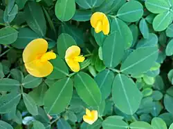 Pinto peanut is a stoloniferous perennial creeping legume that can reach 20-50 cm in height and form dense swards. It is strongly tap-rooted and has many secondary nodulated roots. The stems are initially prostrate and then become ascendant. The leaves are tetrafoliolate. The leaflets are oblong-obovate to obovate in shape, 4.5 cm long x 3.5 cm broad, glabrous and darker green at their upper side and pubescent underneath. The flowers are yellow, borne on short axillary racemes and very similar to groundnut flowers but smaller. Like groundnut, once pollinated, the flower stalks elongate and grow down into the soil, penetrating up to a depth of about 7 cm. The fruit is a terminal underground, one-seeded pod, 1-1.5 cm long and 6-8 mm in diameter. It is found in the upper 10 cm of the soil.[2]