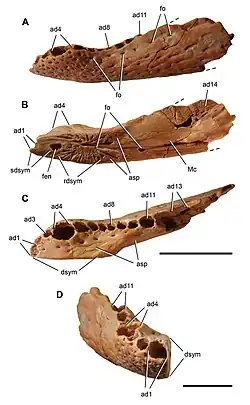 A. wegeneri is estimated to reach 81 centimetres (32 in) long while A. rattoides is estimated to reach up to 1 metre (3.3 ft).[6] Araripesuchus can be distinguished by their laterally bulged edges of the snout, with the bulge being the most prominent around the area of an enlarged maxillary tooth.[5] The snout and premaxilla are also smoother than that of most crocodyliforms, without foramina or the typical rugose texture. There are seven valid species within this genus, all with slightly differing maxillary or dentary structure. A. gomesii, A. wegeneri and A. tsangatsangana all have a mild concavity of the external alveolar margin of the premaxilla as viewed from the ventral surface; A. rattoides may also have this feature, although this part of its skull is not known, as the dentary suggests that this would be the case. A. rattoides also had the distinctive feature of a highly enlarged and forward-pointing first dentary tooth referred to as an incisiform, resembling the elongated incisors found in rodents (hence the specific epithet).[6]