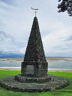 The canoe then travelled north up the coast, past Whakaari (White Island), to the Coromandel Peninsula, where Tama-te-kapua first sighted the mountain Mount Moehau and laid claim to it as his home and final resting place. At the island Te Poito o te Kupenga a Taramainuku just off the coast, Ngātoro-i-rangi deposited the tapu kōhatu (sacred stone), holding the mauri to protect the Arawa peoples and their descendants from evil.[14] Heading south again, the Arawa landed at Reponga island, where the crew left two magic birds, called Mumuhou and Takareto, to let voyagers know when the sea would be rough or calm.[23] They continued until Tama-te-kapua caught sight of the Maketu peninsula, which he staked a claim to, declaring it to be "the bridge of my nose." Other members of the crew began claiming the land: Tia declared the area northwest of Maketu to be the belly of his son Tapuika and Hei called the next hill north of that the belly of his son Waitaha.[23] They brought the Arawa up the Kaituna River at Maketu, tying the bow to a rock called Tokaparore and the stern with an anchor called Tuterangiharuru. Both rocks are features of the landscape today.[23] This landfall took place in December.[23] The spot is commemorated by the centennial monument, erected at Maketu in 1940.