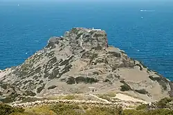 The site of ancient Arkesine was identified in the 19th century from the large number of inscriptions found there.[2] It was situated on the northern coast of Amorgos, not far from the southwestern end of the island, at a place known as Kastri, ca. 1.5 km north of the modern village of Vroutsi.[3] The most conspicuous topographical feature of the site is a steep rocky promontory overlooking the sea, on which the acropolis of the ancient town was located. Substantial remains of the ancient circuit wall of the acropolis survive.[4]