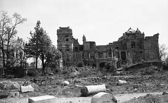 During the First and Second World Wars, the palace was inhabited by the son of Archduke Joseph Karl, Archduke Joseph August and his family. During the siege of Budapest, the Archduke's family fled to the West. The western (Kristinaváros) facade of the building was hit by several shots. According to contemporary experts, the injuries could have been repaired. At the time of the debris removal work, it was a dormitory for industrial students and a workers' canteen. It was evacuated in 1953. It stood empty for a long time and was set on fire in the 1960s for filming purposes. In June 1968, the dilapidated palace was blown up and the ruins along with the foundations were demolished and cleaned. In the 1990s, the palace and the so-called In place of the Josephs Gardens, the state administration had a medieval ruin field built, and later a basement museum was also created below ground level.