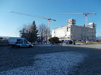 On 23 January 2019, the Hungarian government made the decision to rebuild Archduke Joseph’s Palace as part of the "National Hauszmann Program", the revitalization and restoration program of Buda Castle and its direct environment.[3] At the end of 2020, the Castle Administration published the renderings of the palace and the associated Neo-Renaissance garden, as well as the courtyard stable.[4][1] The implementation contract with the contractor was signed on 15 July 2021, and work began in the area on 16 July.[5]