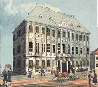 It was auctioned off by the army in 1787, at which time József Teleki (1738–1796), archbishop and crown guard of Ugoccia, bought it at the suggestion of his secretary, Dániel Cornides, a professor at the University of Pest. Teleki had a U-shaped, two-story, 12-apartment palace built here, based on the plans of the Bratislava architect Anton Fisches, in the so-called ‘Zopfstil’ style. It was completed in 1789, at which time it received its long-used name, the Teleki Palace. It was not used as the primary residence for the Teleki family. In 1857, it was bought by the imperial treasury and assigned to Archduke Albrecht, who was military governor-general of Hungary between 1851-59.