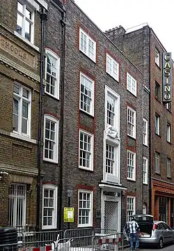 Number 6 dates from the mid-18th century. The facades of Number 7 and Number 16 are circa 1800.[2] 9-11 Archer Street - Archer Street Chambers - was built in 1882/3 as dwellings for artisans: a plaque marks its renovation, completed in 1981.[5] Number 12 was Giovanni Defendi's delicatessen in the 1880s, housed the Italia Conti drama school from 1945 to 1972, and opened as the Bocca di Lupo restaurant in 2009. The London Orchestral Association building (1912, by architects Henry Percy Adams and Charles Holden) spans Numbers 13 and 14.[6] The relief Euterpe (1912) by Charles James Pibworth (1878-1958) is on its facade.