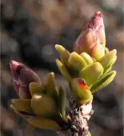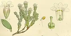 The Archeria genus is a part of the Ericaceae family, a family of flowering plants that is commonly referred to as the heath family. Archeria serpyllifolia is one of six species under the Archeria genus.[3] This shrub is characteristically woody and rigid, ranging from approximately 15–25 cm in height, and exhibiting fasciculate, ascending branches, that are somewhat glabrous in appearance. The leaves have a high resemblance to those of Epacris serpyllifolia, which are small (up to 5 mm long), suberect, elliptical-ovate in shape, very thick and coriaceous and exhibit a minutely serrate edge.[1] Leaves also display a few veins on their light green under surface and are generally blunter than those of the similar species Archeria comberi, which also differs in having solitary flowers.[2] The flowers are crowded on a short, erect terminal, with six to eight flowered racemes. The peduncles bracteate at the base, and pedicels have one bracteole at their insertion.[1]