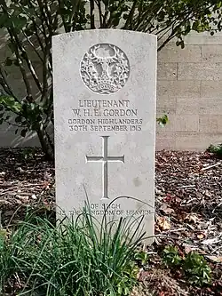 • William Hyde Eagleson Gordon (23 August 1893 – 30 September 1915), twin of Archibald George Ramsay Gordon. He studied at Haileybury College and Sidney Sussex College, Cambridge and enlisted in the army with the Gordon Highlanders in 1914 as a Temporary-Lieutenant. He landed in France on 5 May 1915 and served as a lieutenant in the 8th Battalion, Gordon Highlanders.[3] On 27 September 1915, William became mortally wounded during the Battle of Loos and suffered from a head wound. He succumbed to his wounds on September 30, 1915, in Etaples Military Hospital at the age of 22. He is buried in the Etaples Military Cemetery in Pas-de-Calais, grave I.B.17. Lieutenant William Hyde E. Gordon is mentioned on the Sidney Sussex College – Ante Chapel Memorial and the Haileybury College memorial.