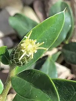 Provided with two thorns (modified stipules), deciduous at the base of the leaves, the flowers are clustered in inflorescences (terminal Flower heads) resembling the hard, scaly flower heads of the familiar, European wildflowers the knapweeds (also members of the Asteraceae). The flowers are white and hermaphrodite, 5 stamens with the anthers attached. The fruit is a cylindrical achene about 3-3.5 mm long and 1 mm wide, pubescent, reddish pappi 5 mm long.[2]