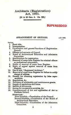 - Architects (Registration) Act 1931 (21 & 22 Geo. 5. c. 33);[1]